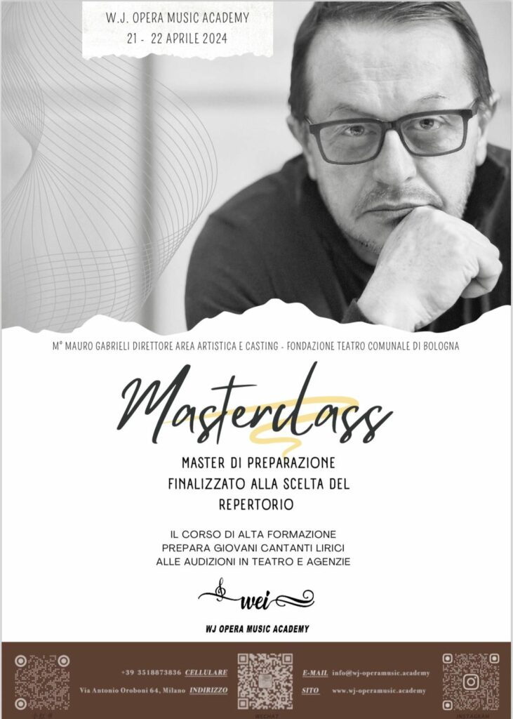 MUSIC ACADEMY WEI JIANG - OPERA STUDIO I CORSI MASTERCLASS Canto lirico tecnica vocale con il Maestro Antonino Siragusa (scopri il curriculum)I giorni 5 / 6 / 7 aprile 2024 MASTERCLASS Master di preparazione finalizzato alla scelta del repertoriocon il Maestro Mauro Gabrieli (scopri il curriculum)I giorni 21 / 22 aprile 2024